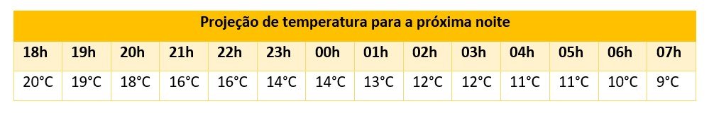 Uma queda maior na temperatura já poderá ser percebida pelos anapolinos na próxima noite – de hoje (17) para amanhã (18). Veja abaixo a projeção de temperatura hora a hora a partir das 18h: