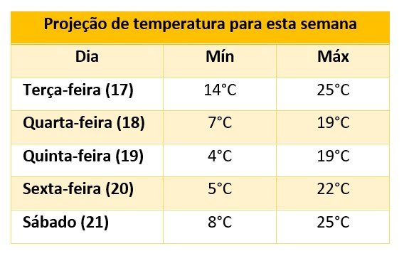 No domingo a mínima prevista é de 10 graus e a máxima de 26 graus. A partir daí as temperaturas voltam a subir gradativamente.