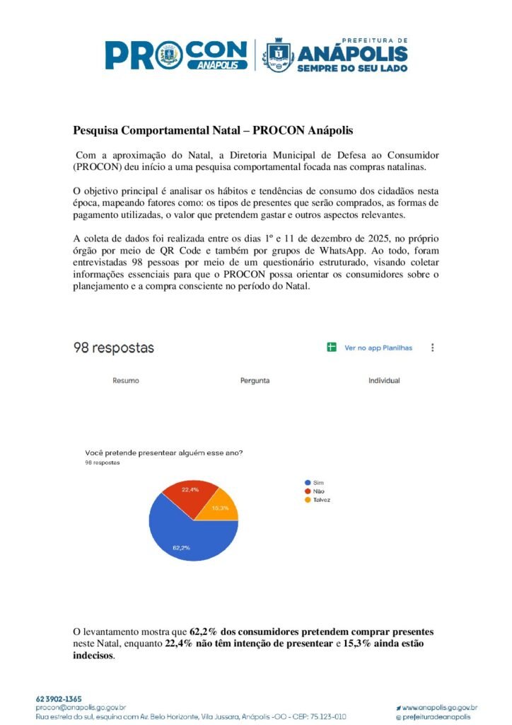 Com a proximidade das festas de fim de ano, o comércio anapolino é impulsionado pelas compras de Natal. Para entender o comportamento dos consumidores neste período, o Procon Anápolis realizou uma pesquisa comportamental entre 1º e 11 de dezembro, entrevistando 98 pessoas por meio de um questionário.