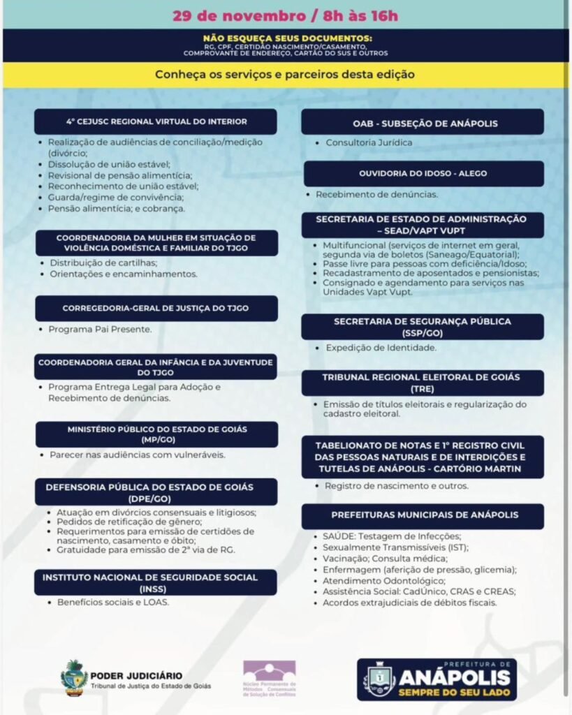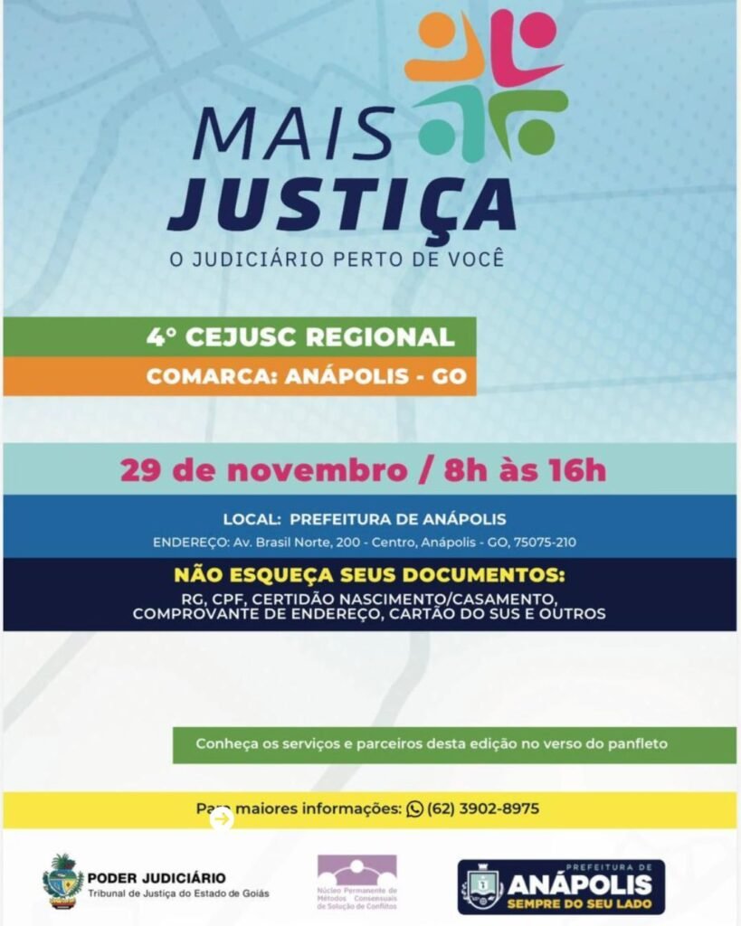 No próximo dia 29 de novembro, mais uma edição do programa Mais Justiça – O Judiciário Perto de Você, promovido pelo Tribunal de Justiça do Estado de Goiás (TJGO). O evento será realizado das 8h às 16h, no Novo Prédio da Prefeitura de Anápolis, Centro Administrativo Adhemar Santillo.